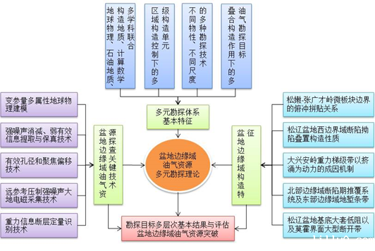 在多个自然科学基金及省部级项目的持续支持下,在东北地区组织实施了多条综合地球物理剖面信息采集和综合研究;经过多年研究实践,创立了油气资源多元勘探理论,创建了盆地边缘域油气资源探查方法技术,给出了盆地边缘域构造问题新认识,在盆地边缘域发现了油气新资源,从勘探理论到勘探技术以及油气探查均取得原创成果。并且,为实现在复杂环境